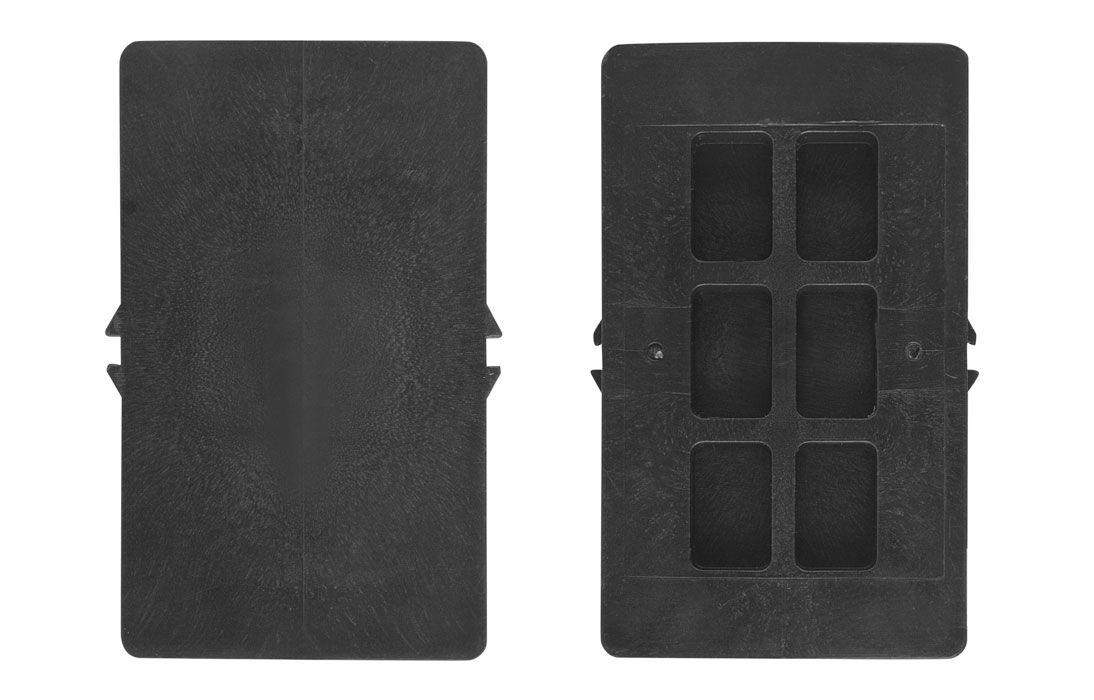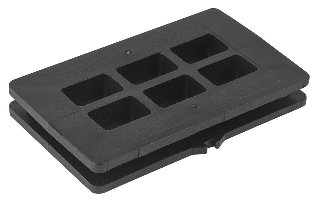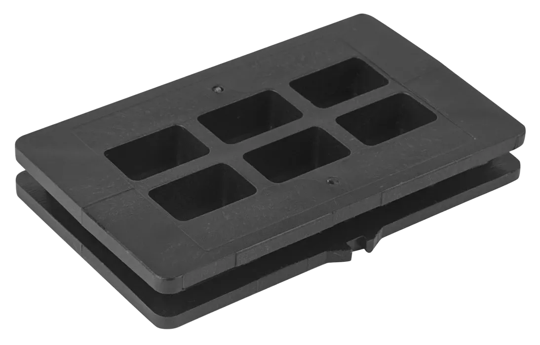Заглушка изготавливается из пластика. Герметизация вводимых кабелей осуществляется за счёт использования эластичного материала залитого по периметру заглушки.