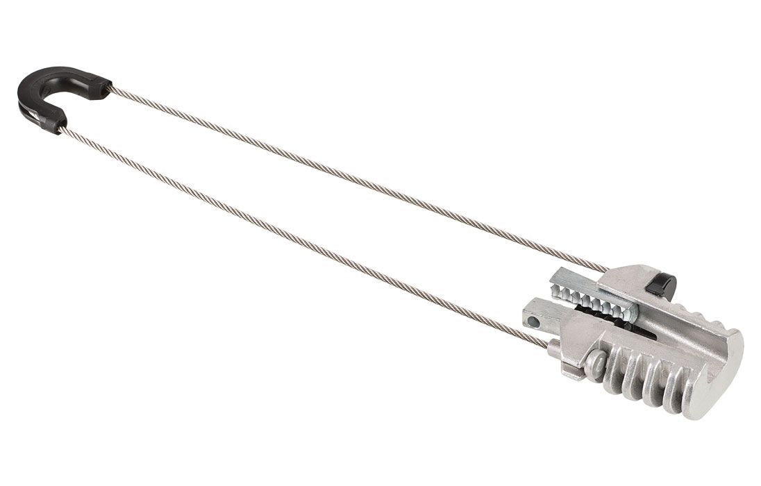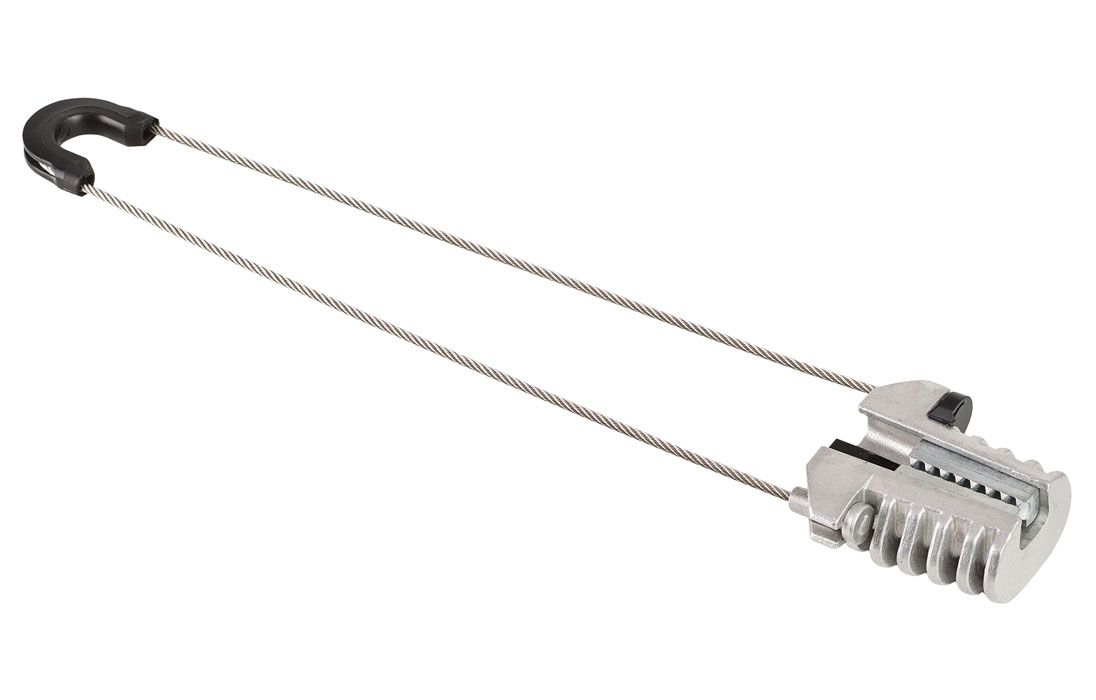 Зажим состоит из открытого конического корпуса усиленного ребрами жесткости, пары зубчатых клиньев (зажимное устройство) и гибкой петли. Устанавливается парами в начале, конце и в интервале 3- 5-ти опор по протяженности кабельной линии.