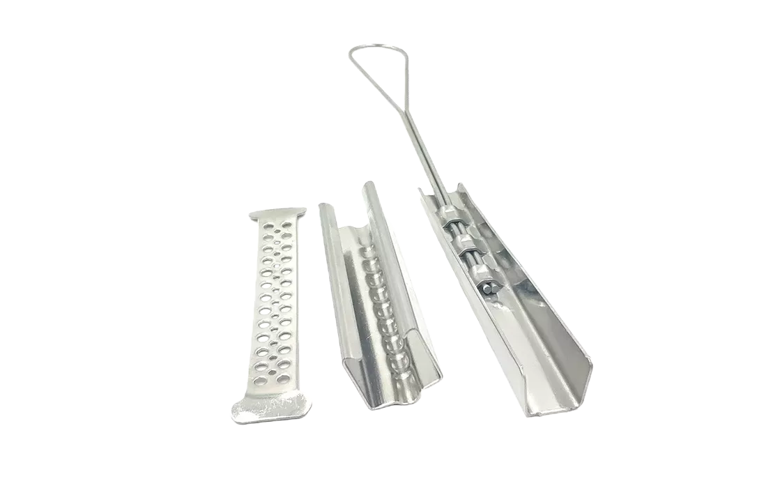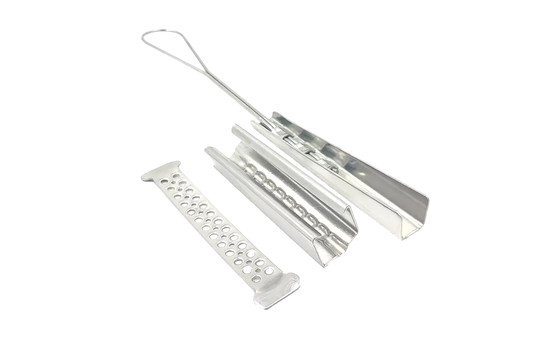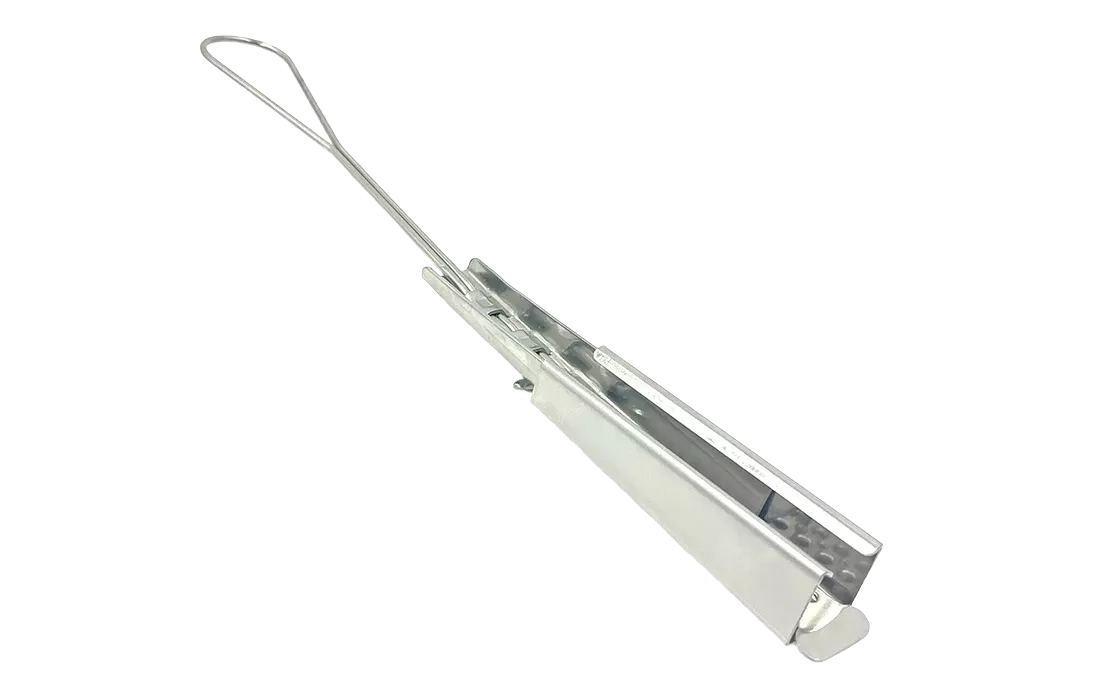 Зажимы изготавливаются из нержавеющей стали. Конструкция зажима исполнена из продольного ребристого корпуса, перфорированной вставки для лучшего сцепления с наружной оболочкой плоских и овальных кабелей и клинообразным стержнем с прикрепленной петлей для монтажа к кронштейнам и узлам.