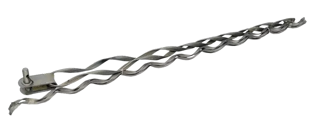 Зажим состоит из силовой части, которая представляет собой U-образную прядь из нескольких спиральных проволок, скрепленных между собой специальным раствором, с внутренней стороны которых нанесет абразив. Протектор для дополнительной защиты кабеля представляет собой комплект отдельных спиралей или склеенных прядей, навиваемых на поверхность провода.